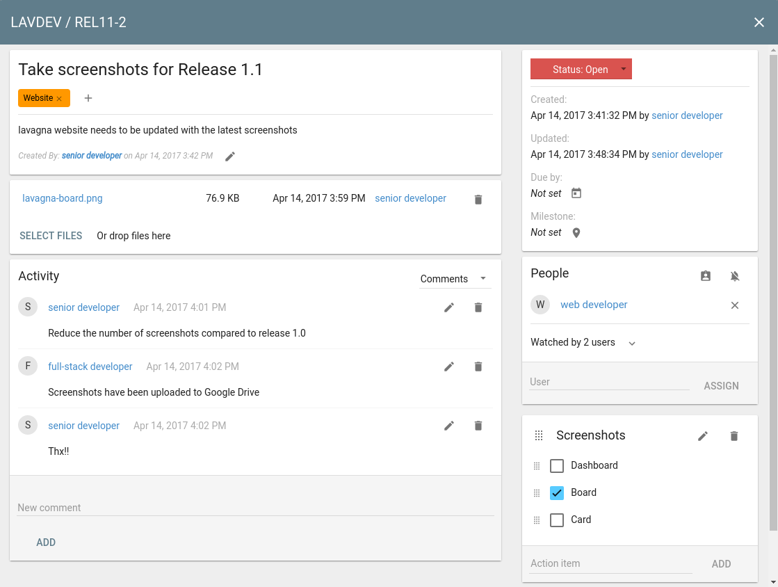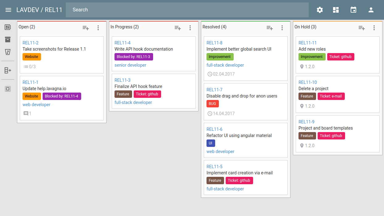 Lavagna gives you the ability to define projects the way you want: your team, your labels, your milestones, your board.